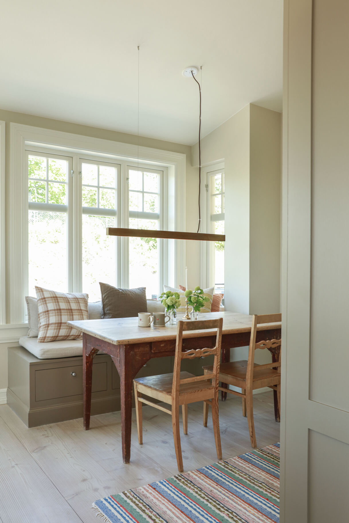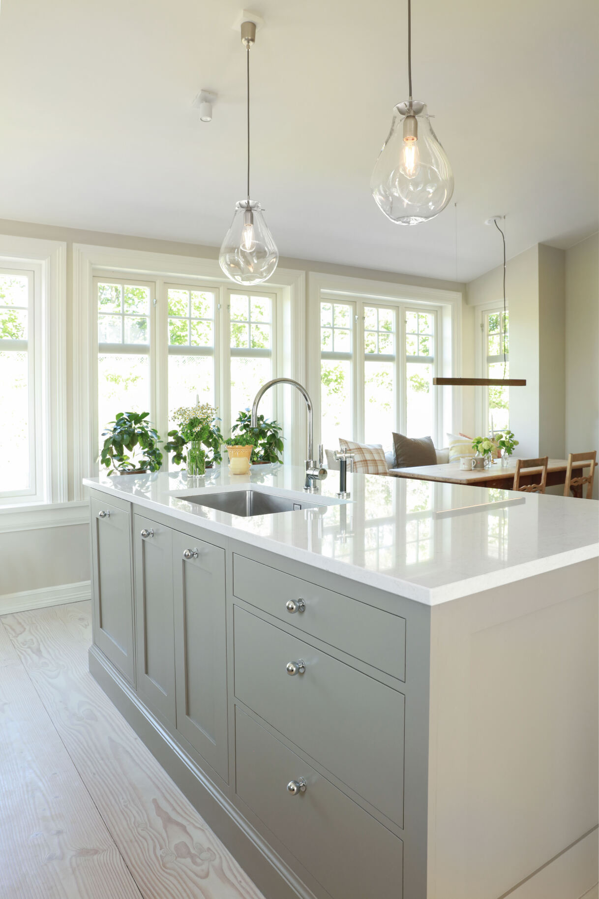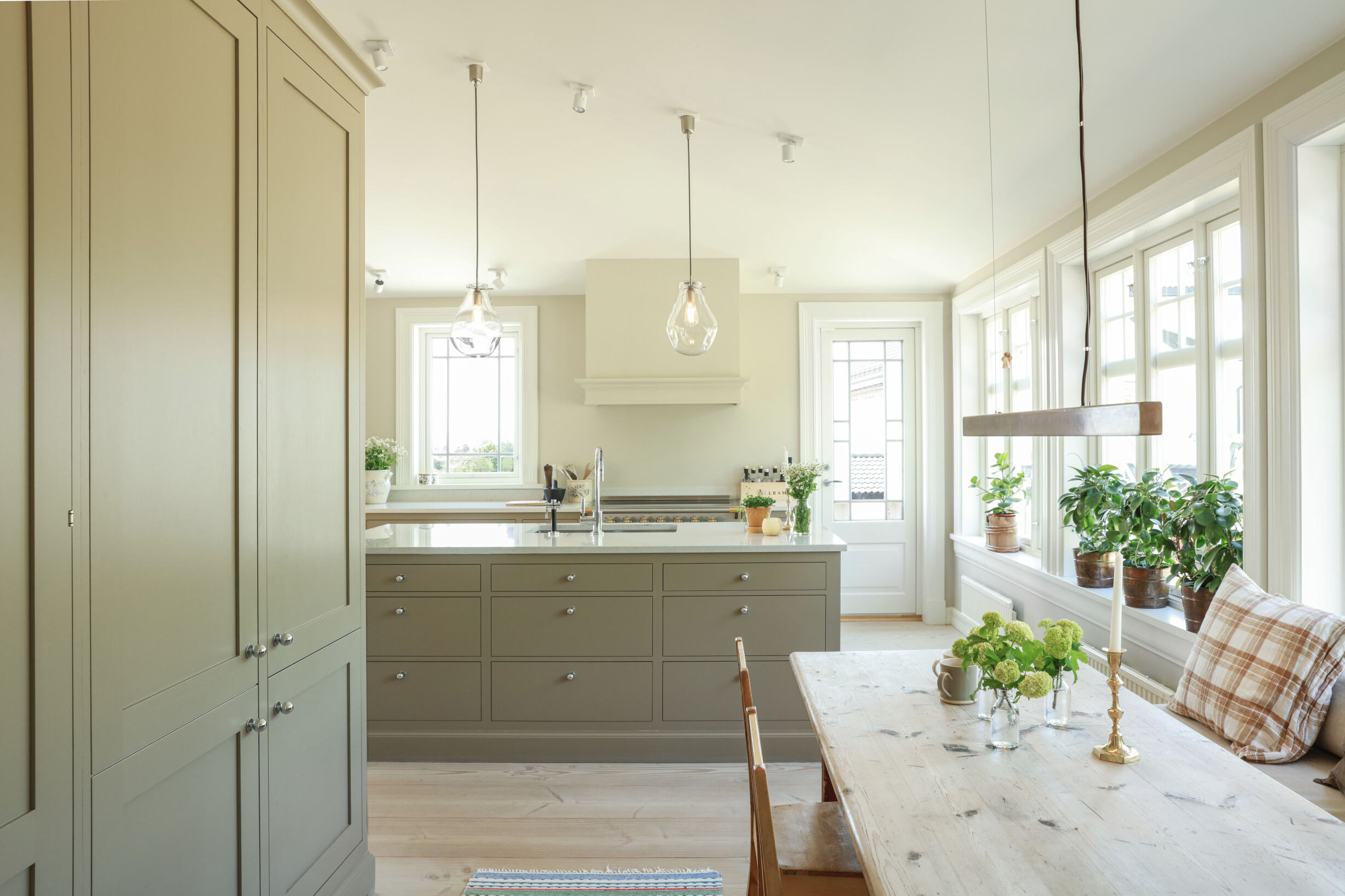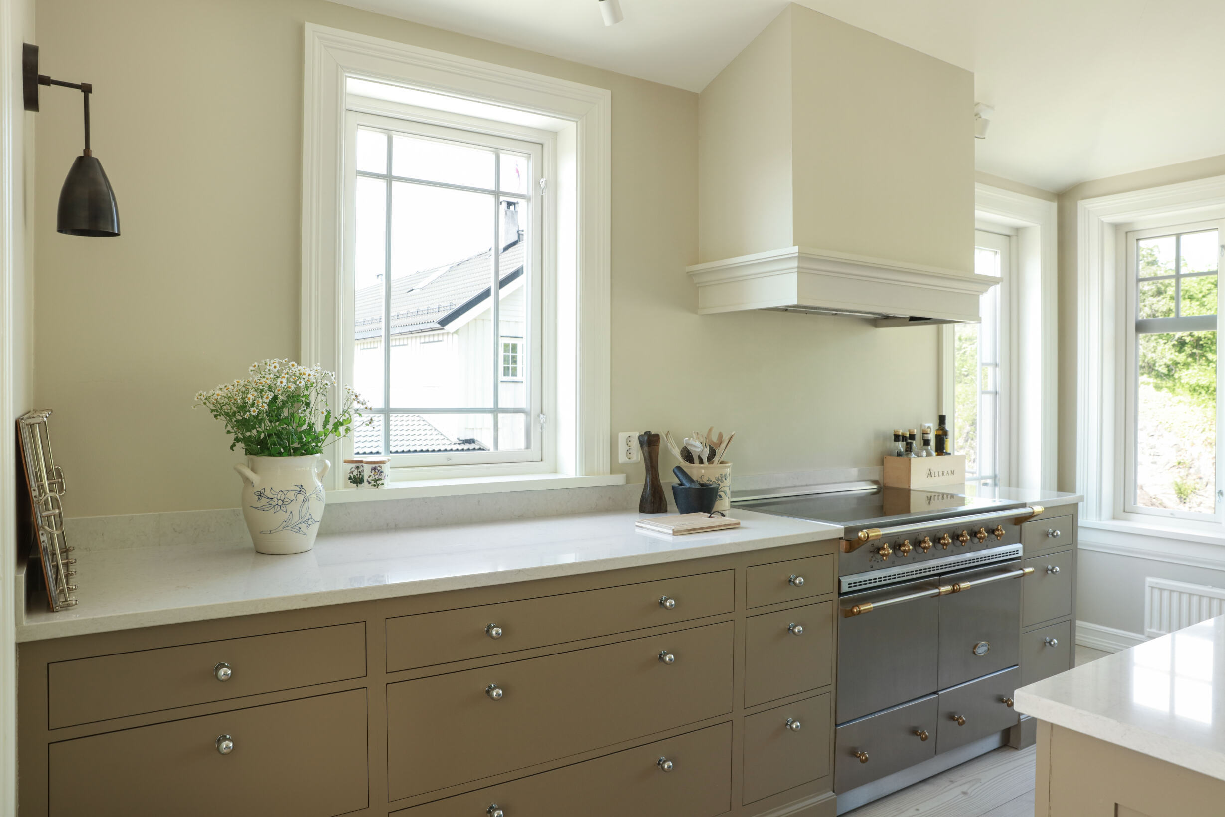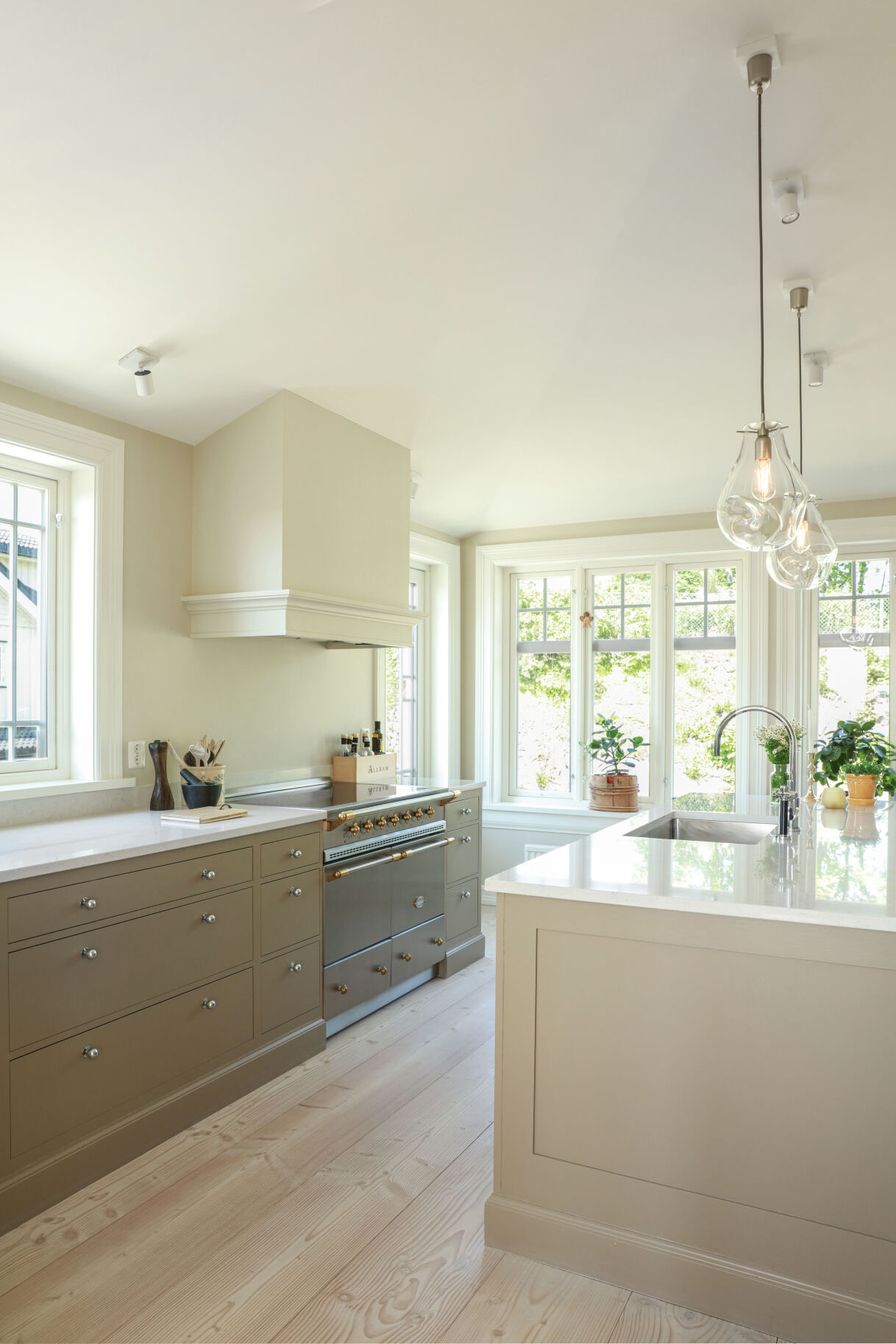 Harmoninen sekoitus tyyliä ja laatua. Keittiö on yhdistetty kahteen malliin; sileät laatikot Slätten-mallissa ja kehys Frillen-mallissa. Lattialiesi on Lacanchelta. Keittiö on asiakkaan paikkamaalattu meidän standardi värisävy Nougat. Tyylikäs, eksklusiivinen mestariteos designin ja käsityön kautta.